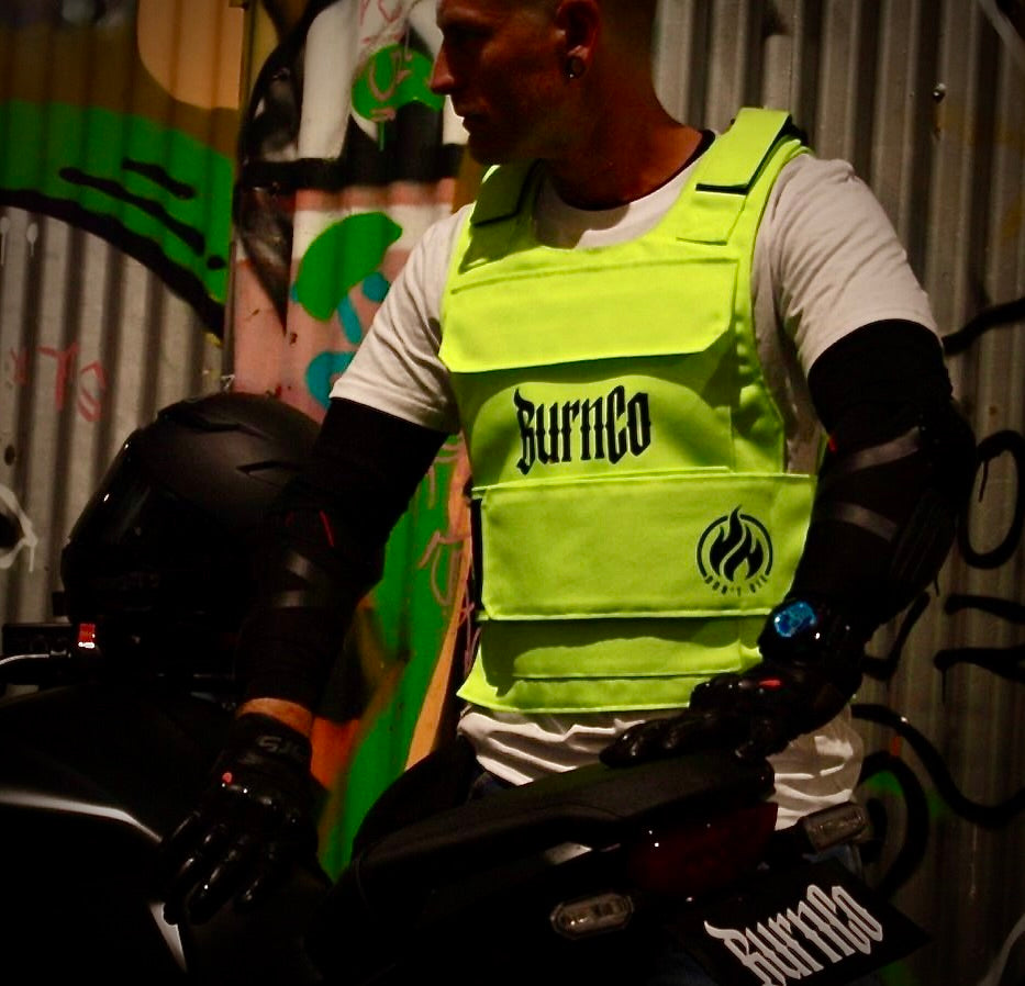 BurnCo vests are built for visibility, attitude, and survival. High-vis motorcycle gear designed by riders who live it.
